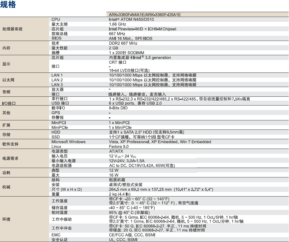 内置英特尔®凌动™N450/D510 1.66GHz的无风扇嵌入式工控机