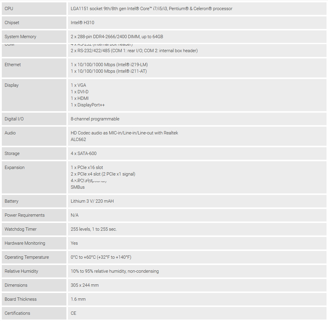 LGA1151 Socket 9th/8th Gen Intel® Core™ Processor, Intel® H310, USB 3.1