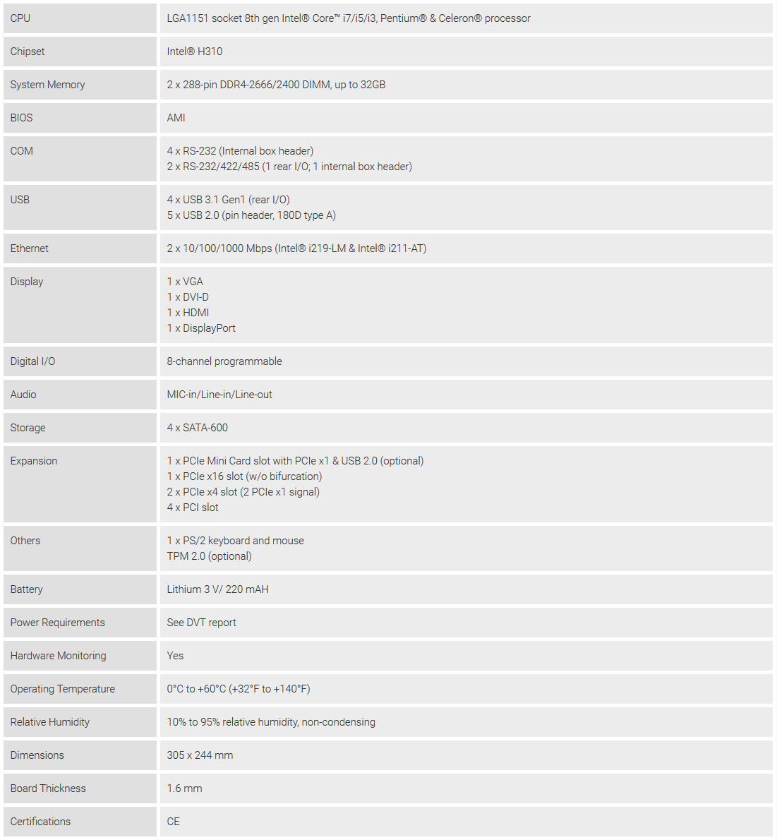 H310, USB 3.1 Gen1, SATA 3.0, PCI Express Mini Card Slot, VGA,