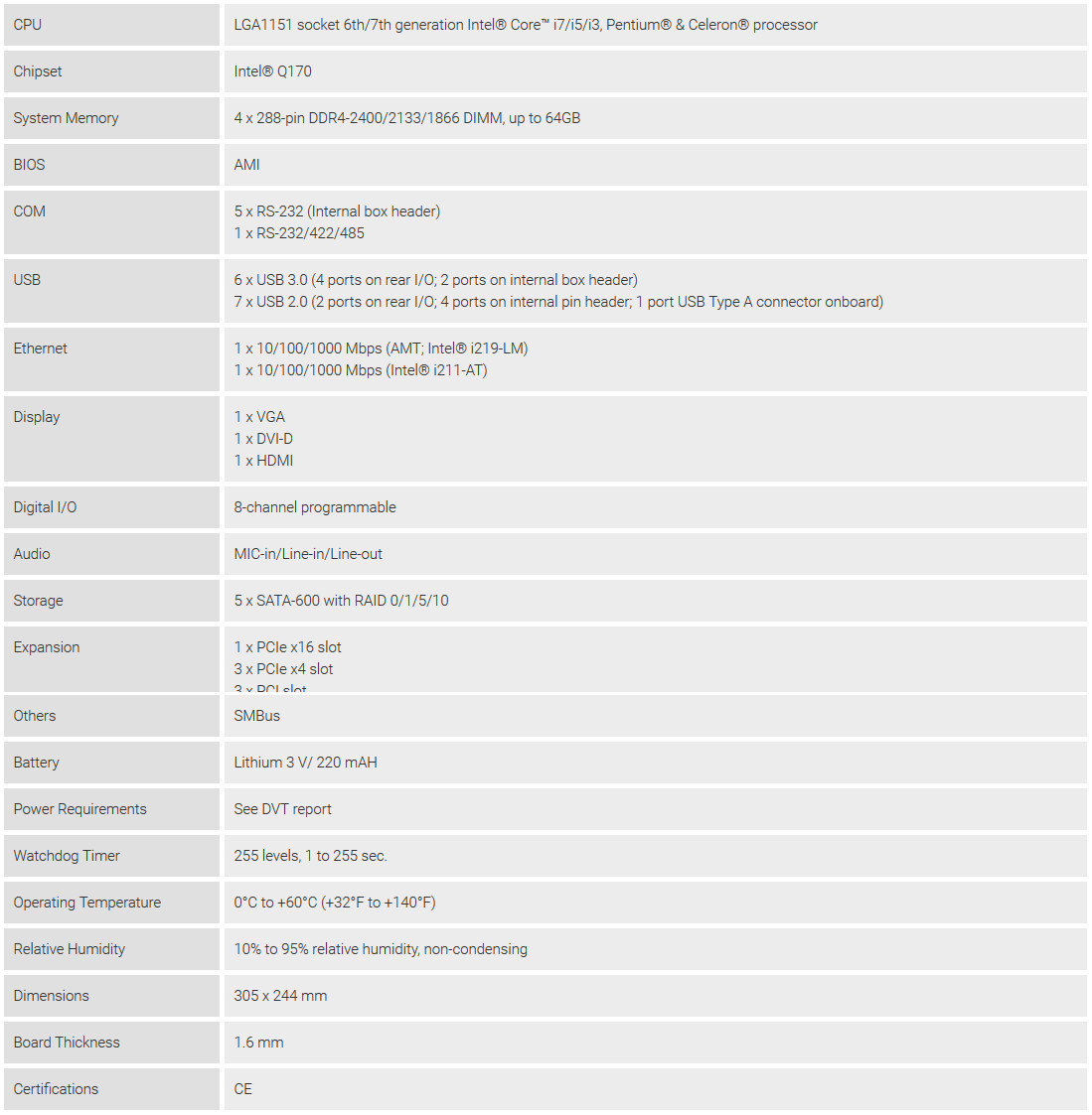 Intel® Q170, USB 3.0, SATA 3.0, Dual LAN, VGA, DVI-D and HDMI